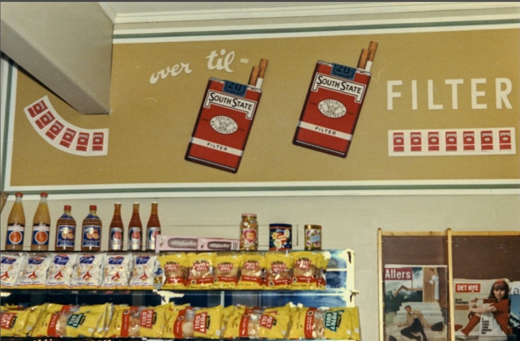 Detalj bak disken, Maarud potetgull kjenner vi igjen, samt ukebladene Allers og Det Nye, men South State med filter har tiden løpt fra.
