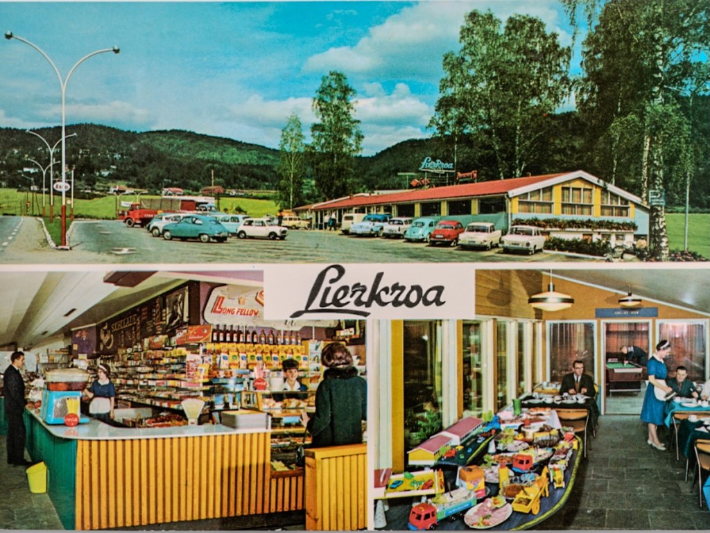 Fortsatt er Lierkroa populær, også for turistbusser. Bildene er Mittets postkort fra 1966. De gir et fint tidsbilde. Legg merke til buffeten, med lekebiler. Lierkroa skulle være for hele familien. Legg også merke til tobakksreklamen. Hvem kvinnen bak disken er, vet jeg ikke. Kanskje noen vet?