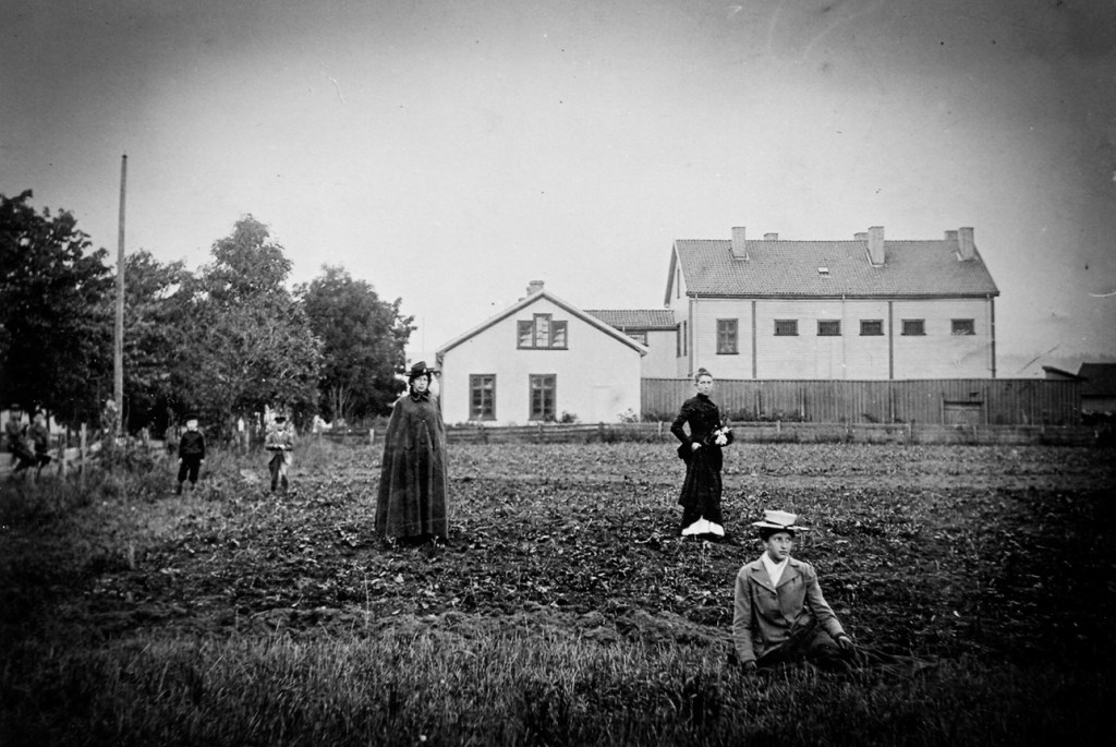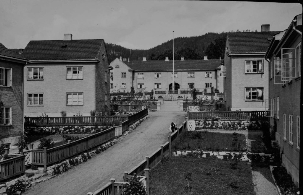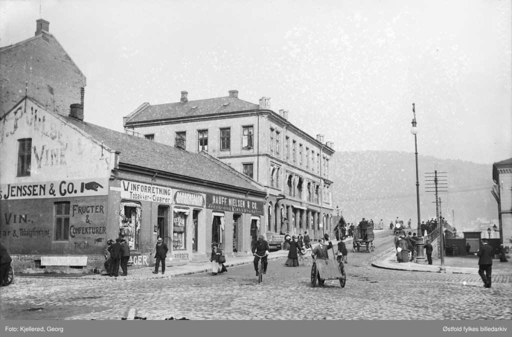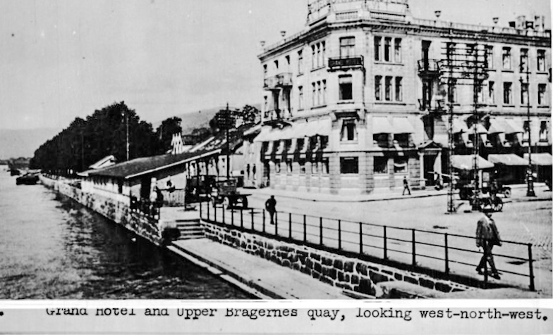 Bildet er tatt fra Gyldenløves plass som den gangen var en nydelig, engelskinspirert park. Den så ut som en forstørret hage med snirklende stier på kryss og tvers. Denne oasen ble først anlagt som hage for «kongen av Strømsø», Daniel Knoff. På 1600-tallet bodde han i en residens bak buskene på bildet. Da bildet ble tatt, var dette herskapelige huset forlengst brent ned, og i dag er det Tollboden Home hotell som ligger her.