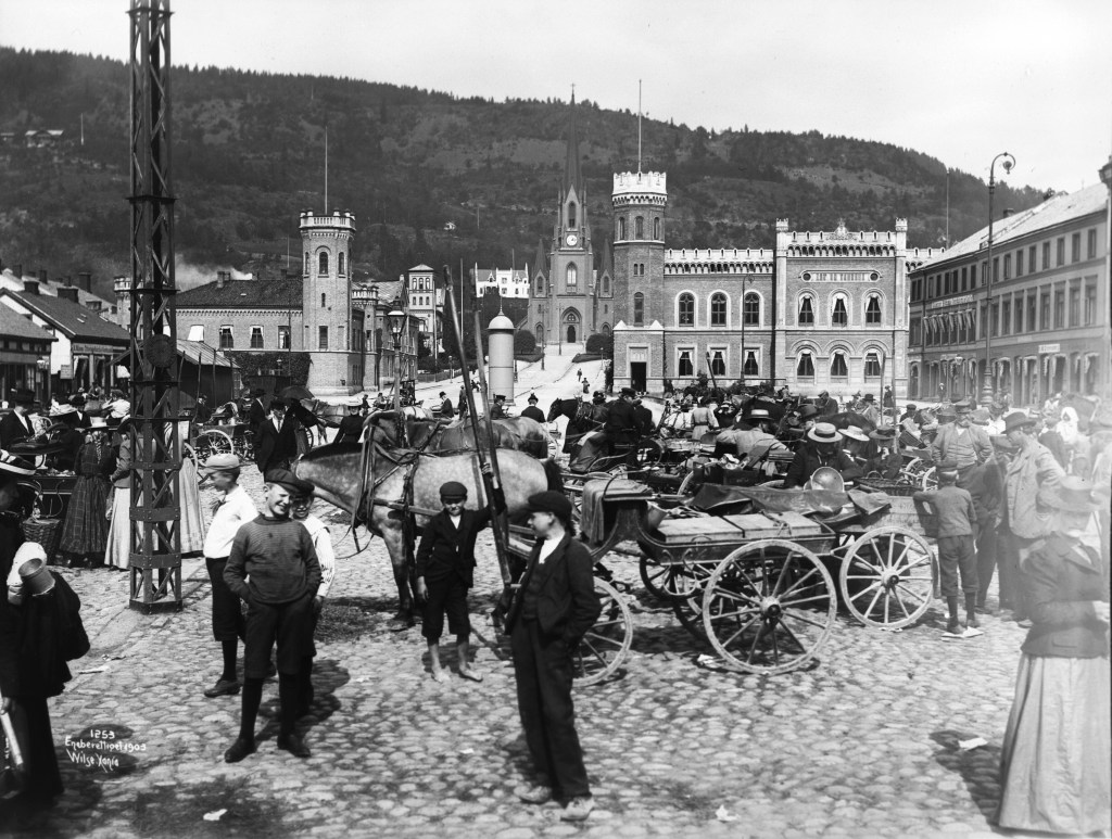 Dette fotografiet, signert Anders B. Wilse, forteller om torghandel tidlig en ettermiddag en torsdag i august 1903. Torget er fullt av liv og røre, unge gutter som kikker på fotografen, et nysgjerrig blikk fra kvinnen til høyre, og hester med kjerrer med varer som skal kjøpes og selges. Det ser ut som et marked for spann, kurver, bøtter slike gjenstander.