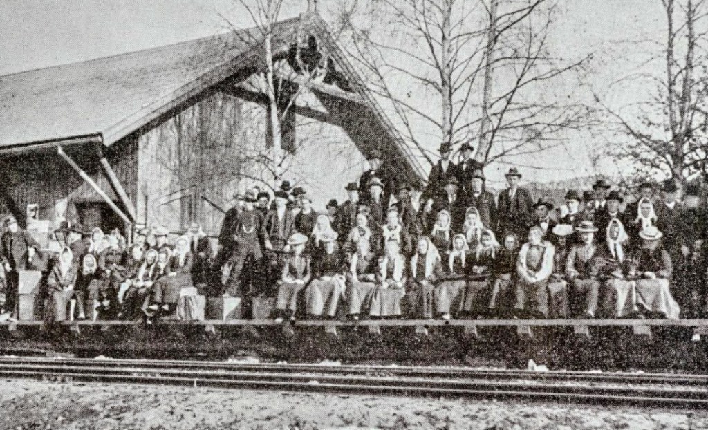 Krøderen stasjon stapp full av hallinger på vei til Jentemarken på Strømsø torg. Årstall: 1903.