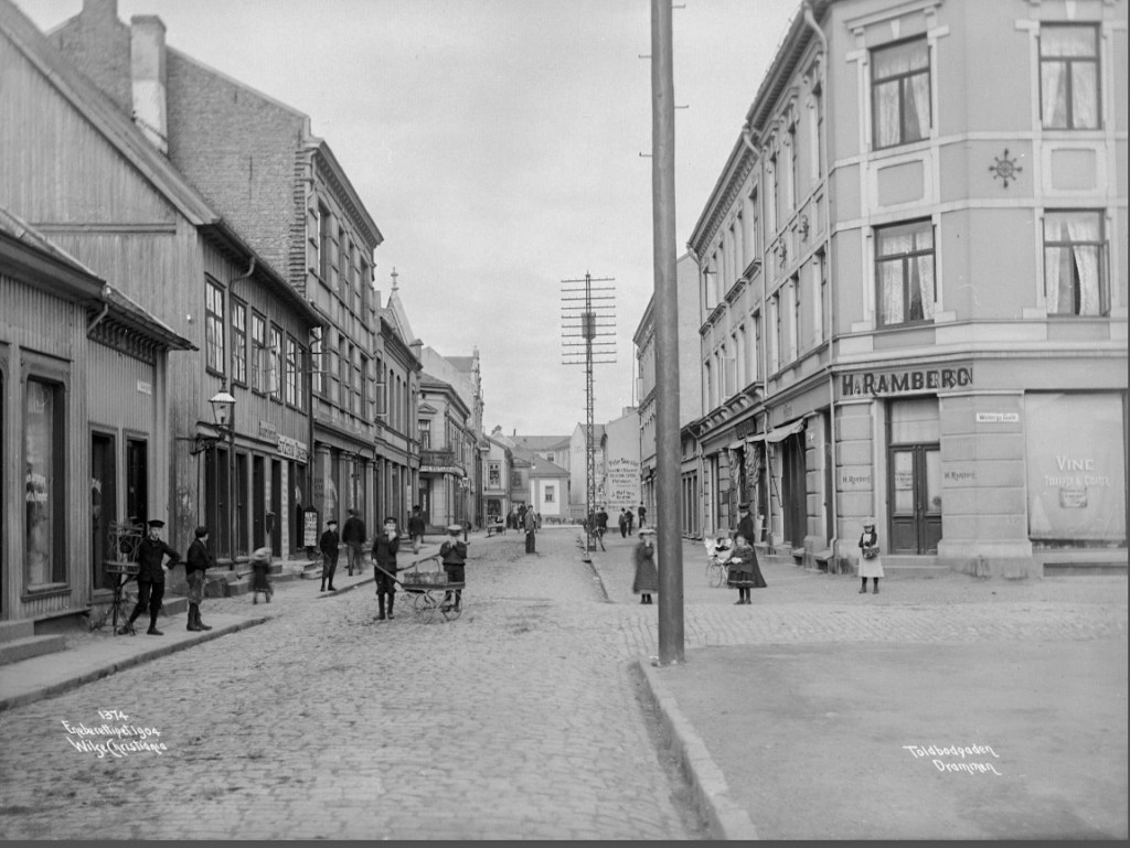 Bildet ovenfor er en vakker skildring for nøyaktig 124 år siden. Bildet er tatt i desember 1901 og signert Anders B. Wilse, fotografen som er en av de beste kildene til norsk folkeliv rundt forrige århundreskifte. Motivet er Konggata i Drammen, den gangen Konggata ikke var delt i to av Rosenkrantz gate, og alle var sikret snø til jul.