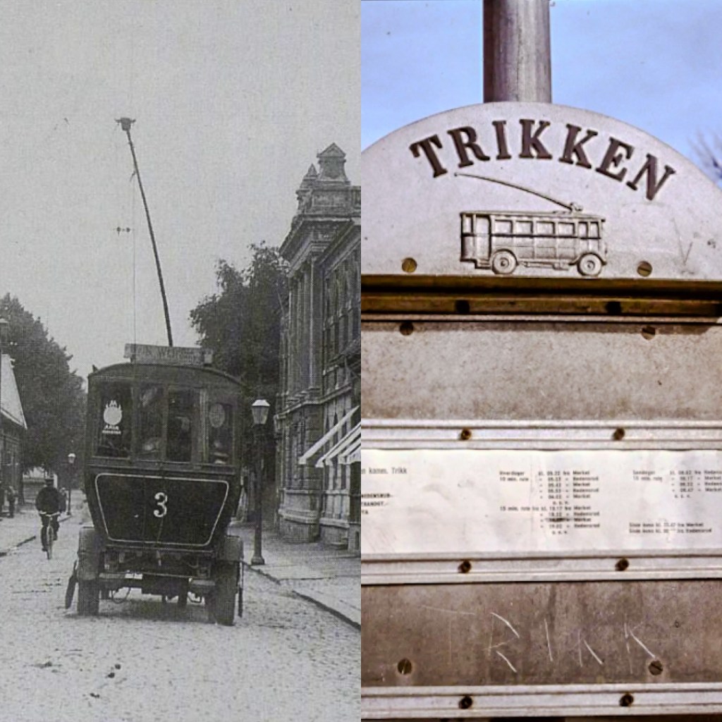 Trikk nummer 3 ble brukt fra starten i 1909. Til høyre holdeplass og rutetider, et kjært byminne for mange. (Fotos: Roy Budmigers samling og Norsk Jernbanemuseum)