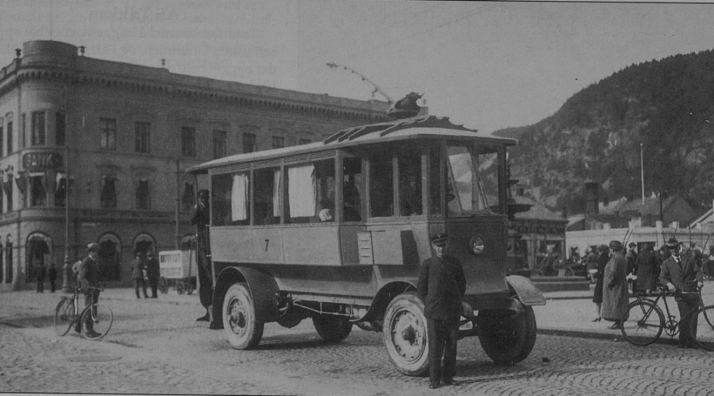Buss nr 7, fotografert på Bragernes torg på begynnelsen av 1920-tallet. Dette var den første som ble bygd i Norge.