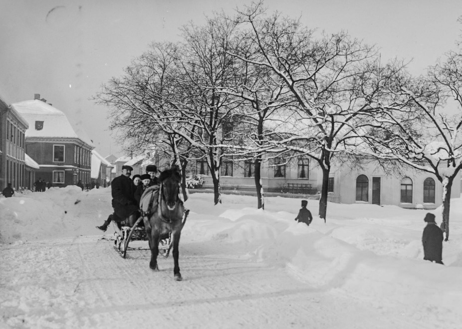 Dette nostalgiske fotografiet fra julen 1901, forteller om en by som har forandret seg mye på 125 år, men mye er også som før på Strømsø. Dessuten oser bildet av norsk vinter og jul. Det er som en hører bjelleklang.