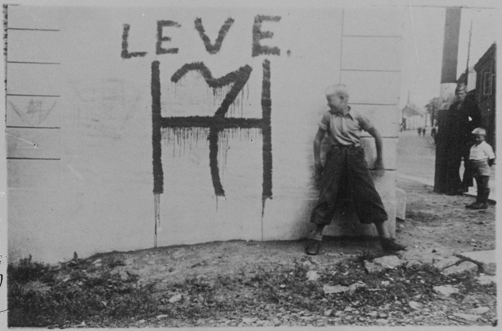 De beste bildene er ofte de som ikke planlegges, men som har i seg øyeblikkets impulsive nerve. Sånn var det med dette bildet. Den lysluggete guttungen er i farta, på tå hev. Det forbudte kongemonogrammet festet med rennende tjæremaling av typen «black ferniss» er ulovlig, trassent og ukuelig. Vi gir oss aldri! Guttungen møter kongen, fremtidshåpet hyller nasjonen. Bildet er genialt i sin enkle symbolikk.