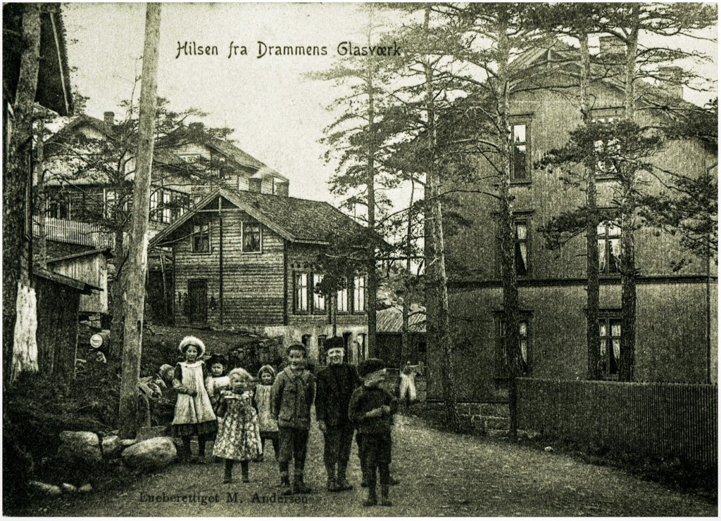 Dette bildet fra tidlig på 1900-tallet viser blide og nysgjerrige unger blant arbeiderboliger på Glassverket. Rett bak ungene er Svelvikveien 83 og til høyre ses arbeiderbrakka «Finland» med adresse Svelvikveien 83.