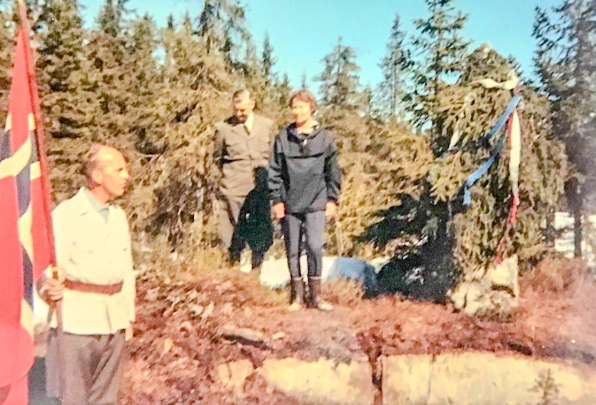 Sigrid fotografert i forbindelse med avdukingen av bautaen på Vestskauen i mai 1970. Til venstre for henne Ahlert Horn, Milorgs distriktssjef under krigen.