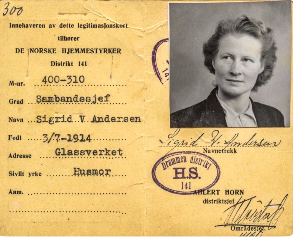 Sigrid Wiborg Andersens legitimasjonskort ved frigjøringen i 1945.