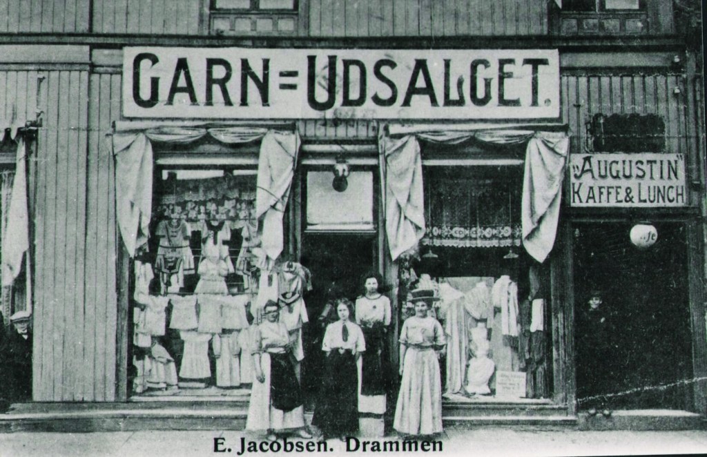 «Garn-Udsalget» og «Augustin Kaffe & Lunch» i Siewers-gården (t.h.), 1914. Foto: Drammen byarkiv.