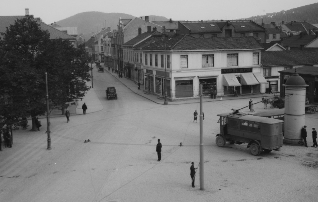 Siewersgården, torget og Tollbugata på 1920-tallet. Vi ser trikken til høyre og forretningen «Fredriksen og Siewers» under markisene på Siewersgården. (Foto: Nasjonalbiblioteket)