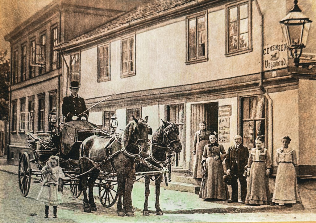 Fru Evensen var en svært driftig forretningskvinne som gjorde vognmannsforretningen om til en gård med en lang rekke ulike butikker og servicetilbud, nøye tilpasset kundenes behov. Her kunne ferjepassasjerene ta en kopp kaffe iog spise kaker eller smørbrød. For de lokale innbyggerne i gata, startet hun både en kolonial og en klesforretning. Det var også hun som sørget for å få konsesjon på en av de første telefonkioskene i byen. Her kunne folk henvende seg for å ringe eller motta beskjeder. På bildet ser vi også ekteparets to voksne døtre, Maria (på trappa) og Hilda som står til høyre for ekteparet. Den unge kvinnen helt til høyre er en tjenestepike.