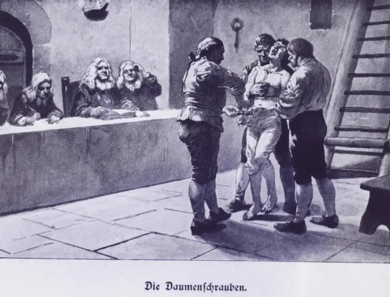 Torturert fange med tommeskrue foran dommerne. Tortur ble brukt for å fremkalle tilståelser, også i trolldomssaker.