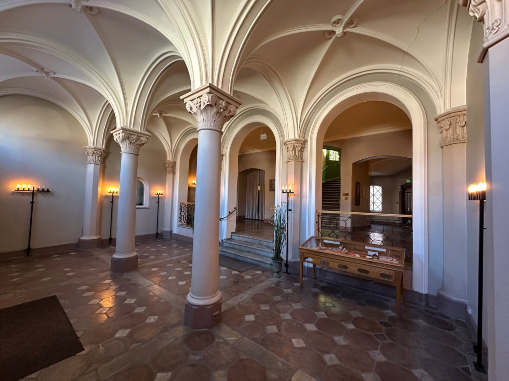 Inngangspartiet i det fredede Gamle rådhuset. To av kvinnene i denne artikkelen hadde sitt arbeid her. Det var også her studentene satt lenket sammen før de ble henrettet i juli 1944.