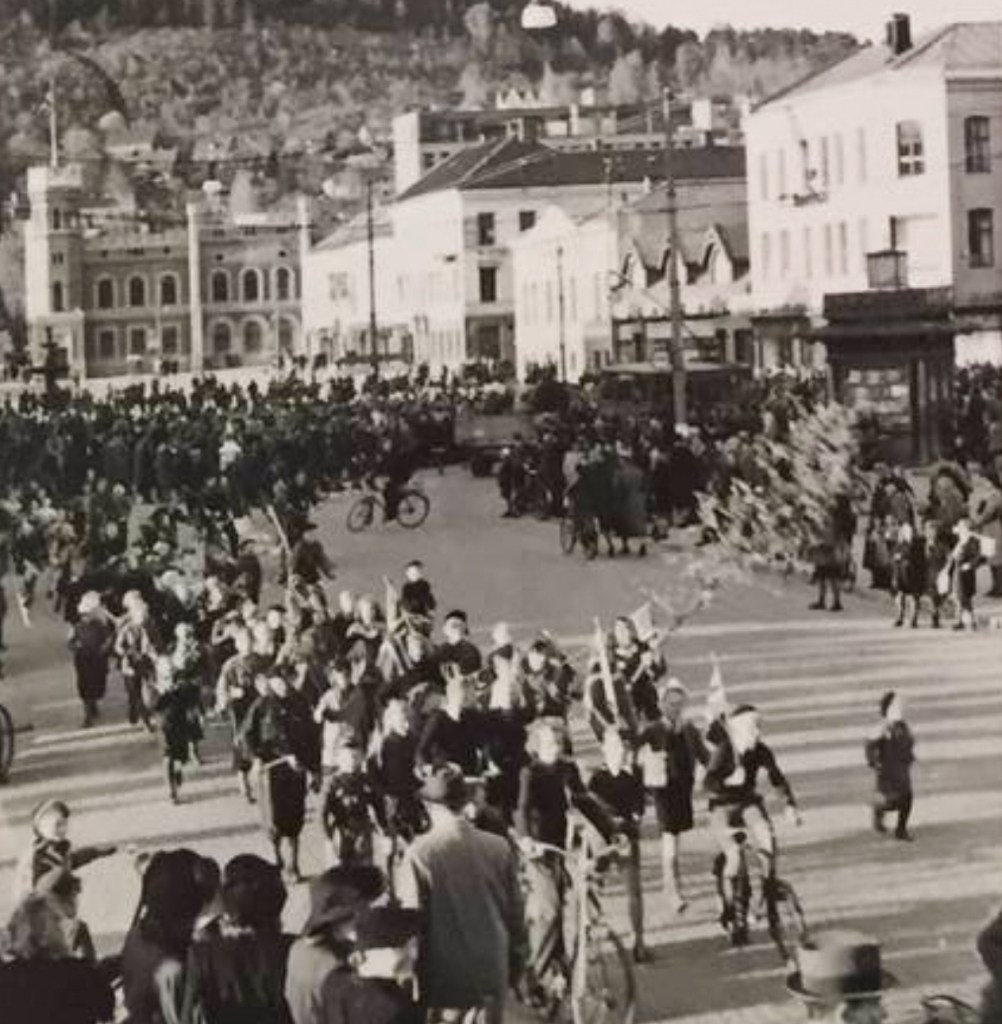 Bildene nedenfor viser også samme sted samme dag, med politiet som observatører. Bildene er utlånt fra Arve Wiborgs familiealbum. Fotograf er ukjent. Bildet er tatt i Torggata i retning torget. Til venstre (nr 10) var den gangen Kofano-gården der Vinmonopolet hadde lokaler, og vis-a-vis Centralgaragen der Nedre Buskerud Boligbyggelag (NBBO) holder til.