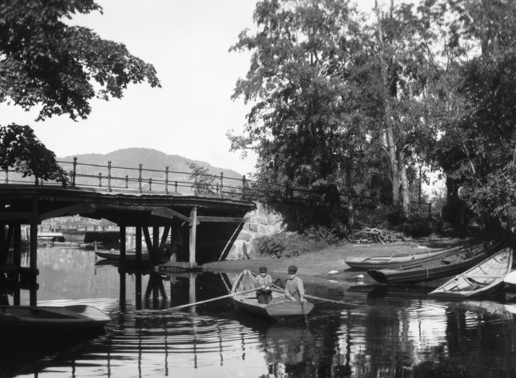 Denne ukas fredagsbilde ble tatt 12. september 1904, en mandag, for 121 år siden. To unge gutter ror en pram, Drammenselva er stille, og vi ser ei bru som forlengst er borte.